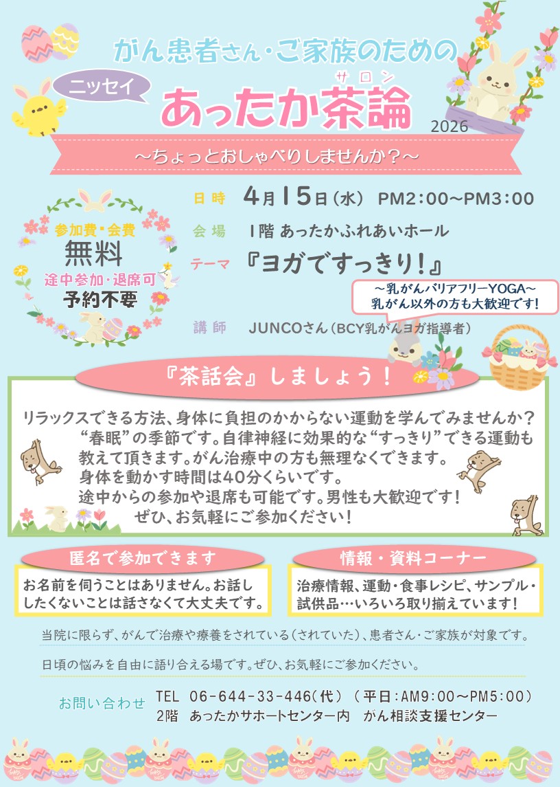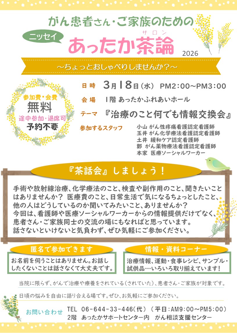 日本生命病院2F がん相談支援センター(あったかサポートセンター内) TEL:06-644-33-446(代)【平日 9~17時】 |