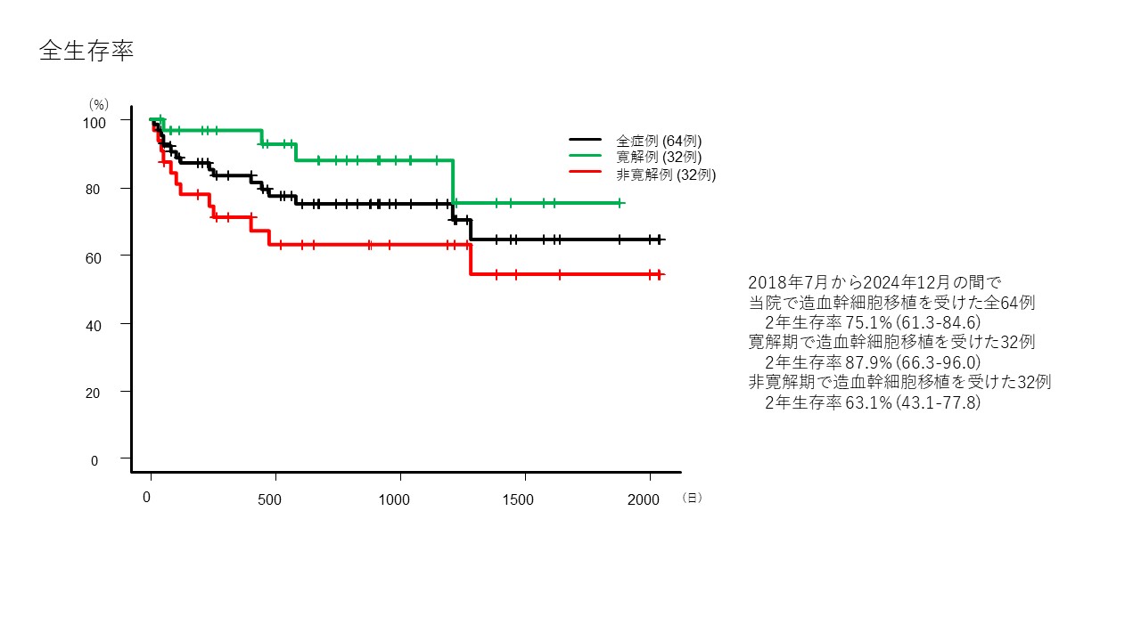 2024年12月31日までに、64例の同種造血幹細胞移植を行い、2年生存率は75.1%です。