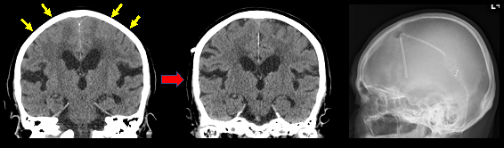図:正常圧水頭症に対する髄液シャント術(脳室シャント)、CTにて高位円蓋部の脳溝狭小や脳梁角の改善がみられる。